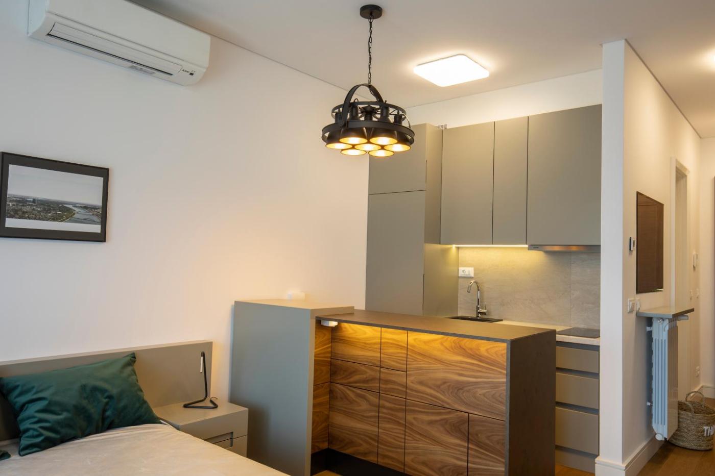 One-Bedroom Apartment. This apartment offers a fireplace. Featuring a private entrance, this air-conditioned apartment comprises a kitchen, 1 bedroom and 1 bathroom with a shower and a hairdryer. The well-equipped kitchen features a stovetop, a refrigerator, kitchenware and an oven. Boasting a terrace with garden views, this apartment also provides a washing machine and a flat-screen TV. The unit offers 1 bed.